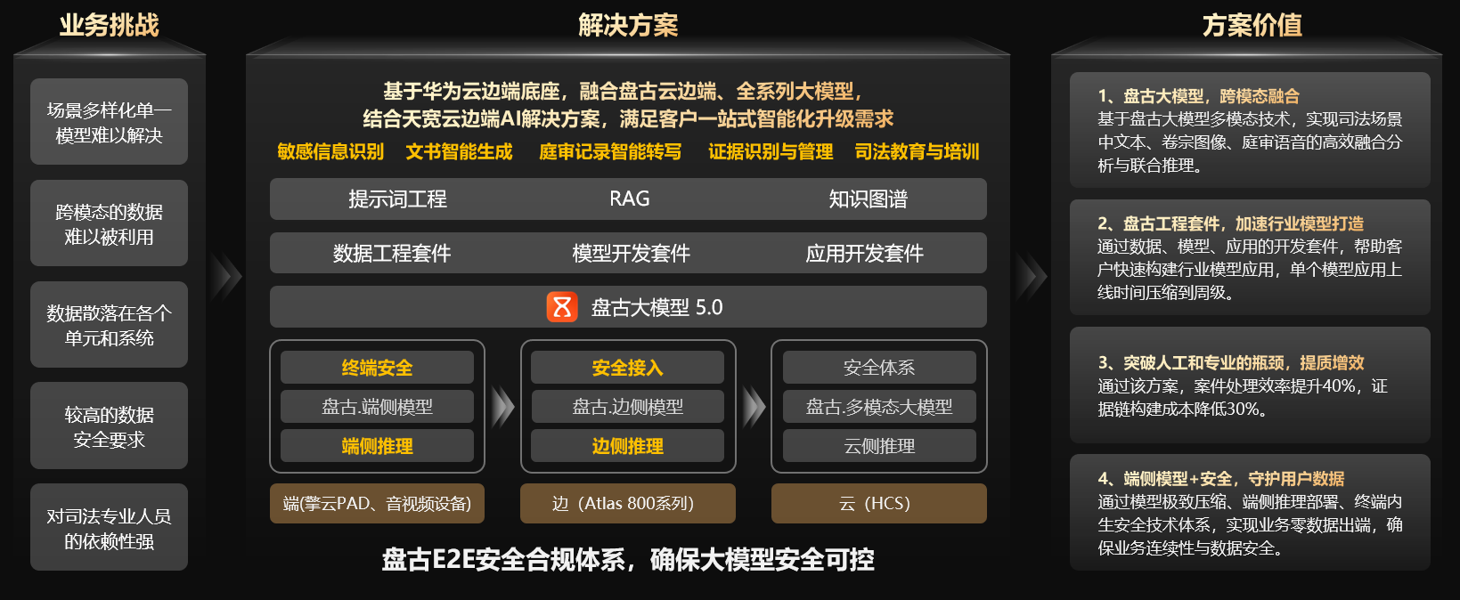 天寬獨(dú)家展出和發(fā)布了基于盤古大模型5.0構(gòu)建的行業(yè)大模型解決方案:司法行業(yè)智法助審解決方案。該方案是基于華為昇騰智算云底座,融合盤古大模型5.0,結(jié)合天寬云邊端AI技術(shù)而打造的聯(lián)合解決方案,構(gòu)建了從證據(jù)智能歸集——庭審記錄智能轉(zhuǎn)寫——文書智能生成的全鏈路AI輔助體系,滿足司法行業(yè)高合規(guī)、高可用的智能化升級(jí)需求。