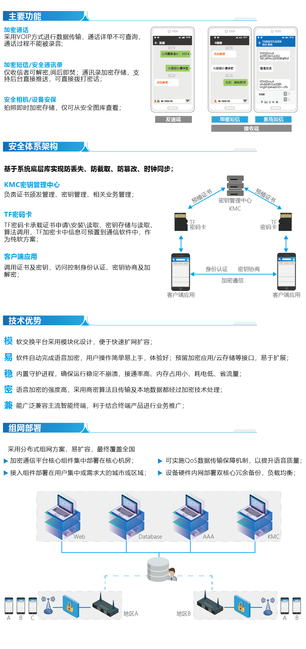 內(nèi)網(wǎng)移動加密通信系統(tǒng)——天寬加密通信系統(tǒng)是經(jīng)國家密碼管理局認(rèn)證的商密級手機(jī)加密防護(hù)系統(tǒng),符合我國商密級別的手機(jī)通信要求。通過移動3G/4G/WIFI方式進(jìn)行加密數(shù)據(jù)的傳輸,具備加密通話、加密短信、安全通信記錄、安全通訊錄等功能。主要用于有效保障移動通信安全,實(shí)現(xiàn)商密級的端到端的手機(jī)語音與短信加密,為黨、政、軍、大型企業(yè)等重要客戶提供專業(yè)化的高安全性的移動通信加密服務(wù)。