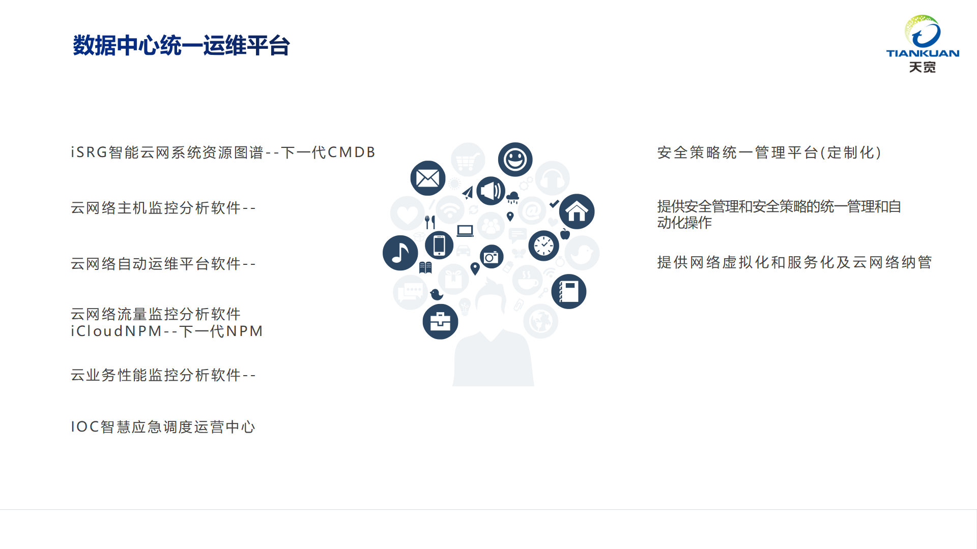 數(shù)據(jù)中心統(tǒng)一運(yùn)維平臺(tái)是基于Snowburger 數(shù)字化運(yùn)維平臺(tái)構(gòu)建的云網(wǎng)監(jiān)控/一體數(shù)據(jù)中心運(yùn)維平臺(tái),包括:云網(wǎng)監(jiān)控平臺(tái)、云網(wǎng)流量性能監(jiān)控系統(tǒng)、虛擬資源監(jiān)控調(diào)度平臺(tái)、運(yùn)維可視化前臺(tái)及應(yīng)用,支持云網(wǎng)的多層、分層、虛擬化資源(SDN)、策略和云網(wǎng)協(xié)議及拓?fù)?,可?duì)接多云和PaaS服務(wù)平臺(tái),支持提供混合云虛擬資源的全生命周期管理和彈性伸縮部署,實(shí)現(xiàn)云網(wǎng)和傳統(tǒng)IT基礎(chǔ)設(shè)施,業(yè)務(wù)和軟件系統(tǒng)的統(tǒng)一運(yùn)維和管理。