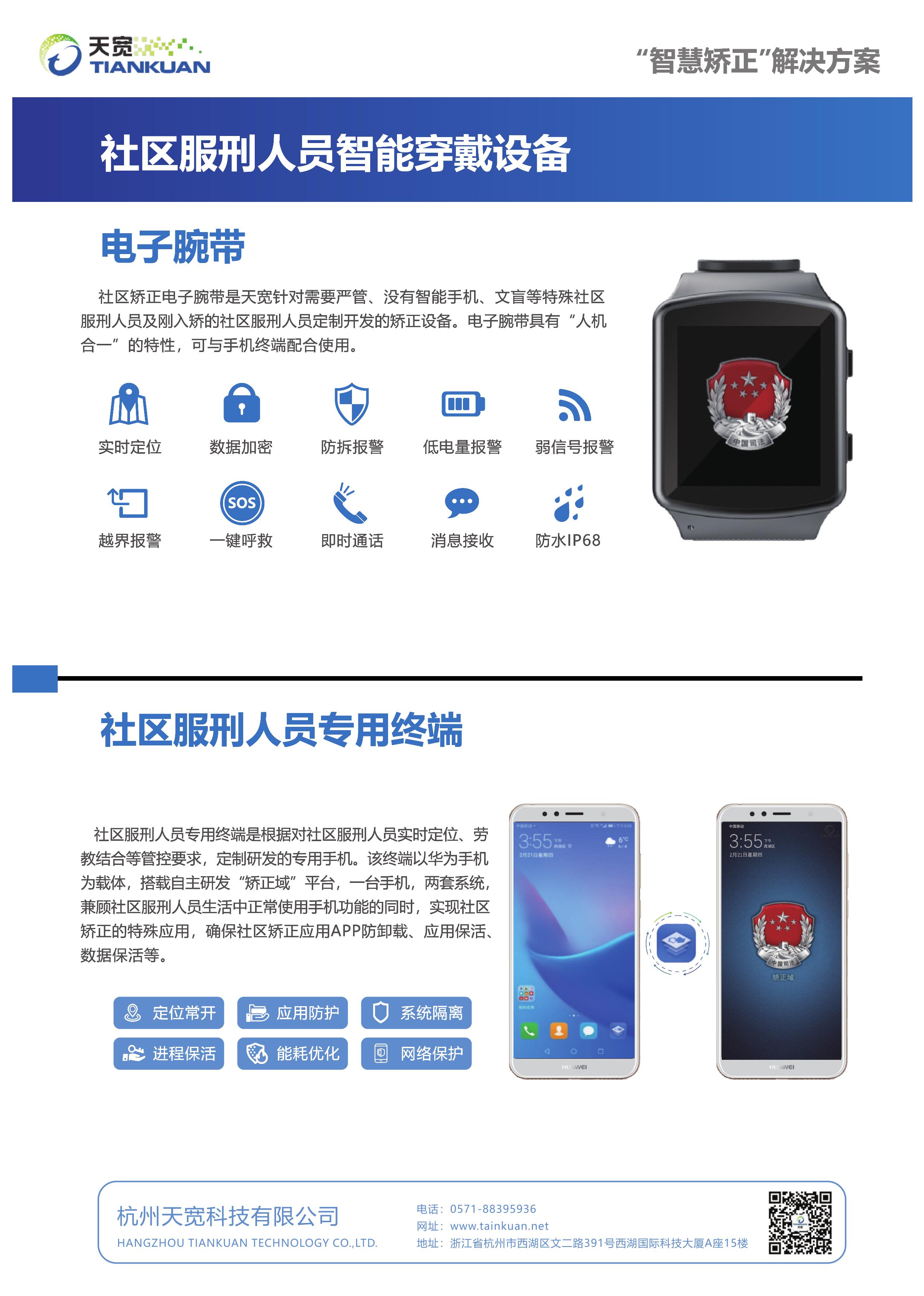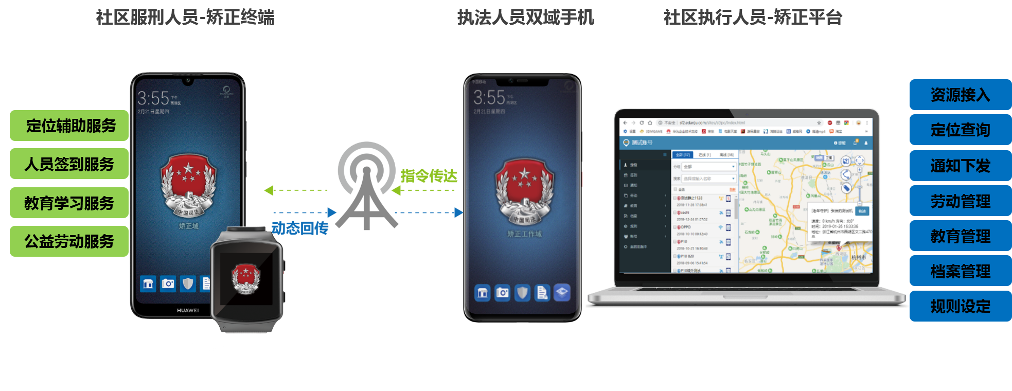 天寬“智慧矯正”移動終端解決方案以華為智能手機(jī)為載體,搭載自主研發(fā)的“安全域” 平臺,為社區(qū)服刑人員、執(zhí)法人員提供軟件應(yīng)用的安全環(huán)境、一機(jī)兩用、保證矯正效果的同時不影響生活中正常使用手機(jī)功能。個人裝備類整體解決方案包括內(nèi)容有電子腕帶、社區(qū)服刑人員專用終端、以及執(zhí)法人員使用的執(zhí)法終端。