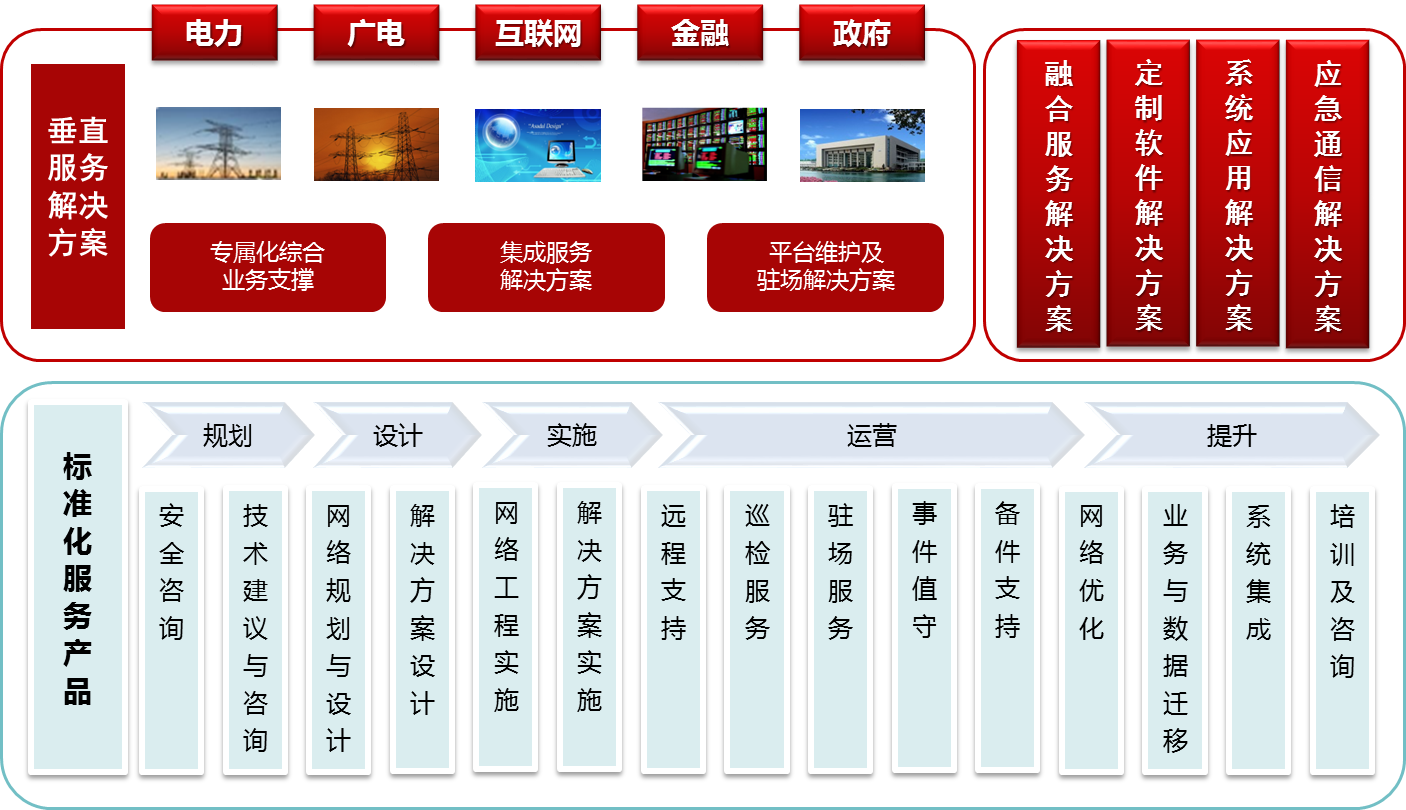 服務(wù)體系化。提供的包括上架安裝在內(nèi)的基礎(chǔ)服務(wù);提供E2E的,增值的服務(wù)解決方案;提供全網(wǎng)或部分網(wǎng)絡(luò)的全面運維支持;面向營收,運營費用和資本支出開展咨詢業(yè)務(wù),旨在協(xié)助用戶更好的制定業(yè)務(wù)及整體方案,幫助提高投資收益率和運營有效性,促進業(yè)務(wù)增長。